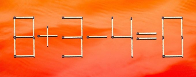 הנה דוגמה של 8+3-4=0, שהוא כמובן לא נכון. אתה צריך רק להזיז גפרור אחד כדי להפוך את המשימה למשמעותית. על פי הכללים של חידות כאלה, אינך יכול להסיר מקלות מהסימן "=" או למחוק אותו, אך אתה רשאי לשנות כל סמל ומספר אחר.